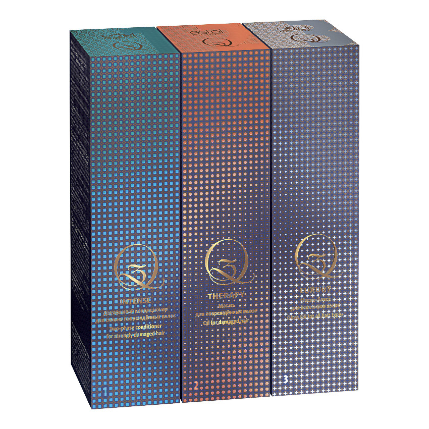 Продукты для процедуры экранирования Q3 THERAPY представлены в элегантном кейсе. В набор для процедуры экранирования повреждённых волос Q3 THERAPY входят: